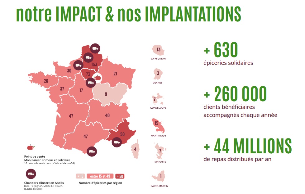 LE RÉSEAU PIONNIER DES ÉPICERIES SOLIDAIRES : créé en 2000 qui fédère et anime plus de 630 structures adhérentes en France, y compris en Outre-mer : des épiceries fixes, itinérantes, mixtes ou étudiantes.