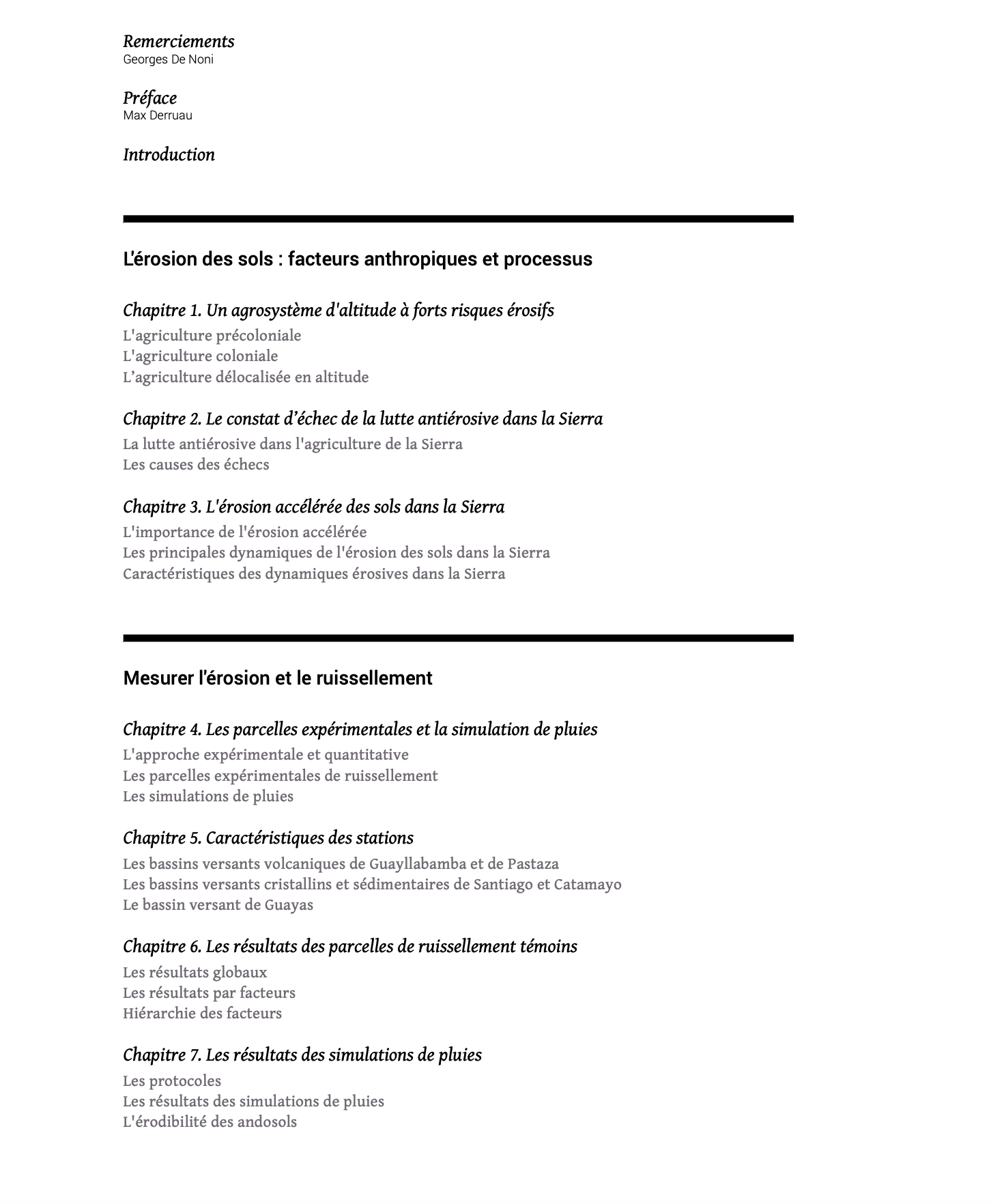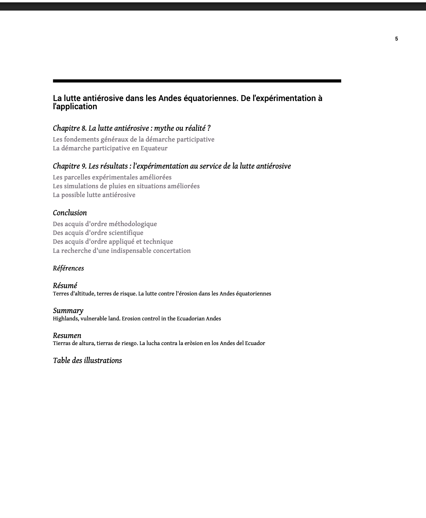 DE NONI, Georges ; et al. Terres d’altitude, terres de risque : La lutte contre l’érosion dans les Andes équatoriennes. Nouvelle édition [en ligne]. Marseille : IRD Éditions, 2001 (généré le 05 décembre 2018). Disponible sur Internet : . ISBN : 9782709917940. DOI : 10.4000/books.irdeditions.8367.