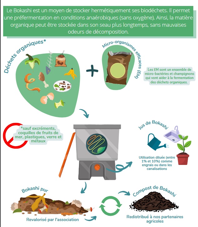 En échange d'une adhésion à l'association, nous mettons à disposition des ménages toulousains un seau d'appartement de type Bokashi et un sac de 2kg de son de blé enrichi aux Micro-Organismes Efficients (EM), et venons collecter les seaux en vélo électrique dès qu'ils sont pleins.